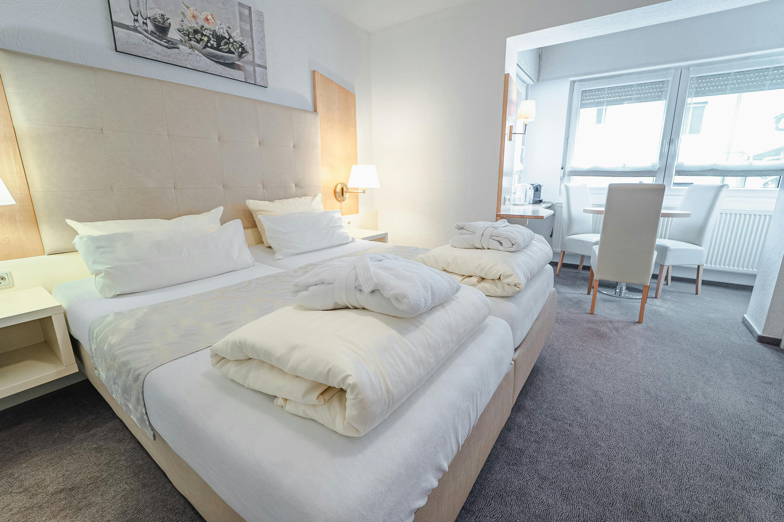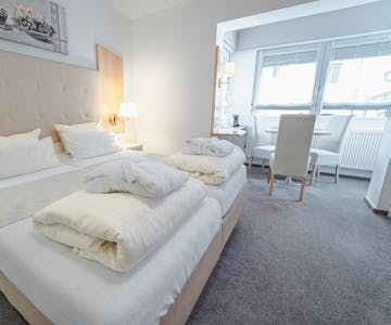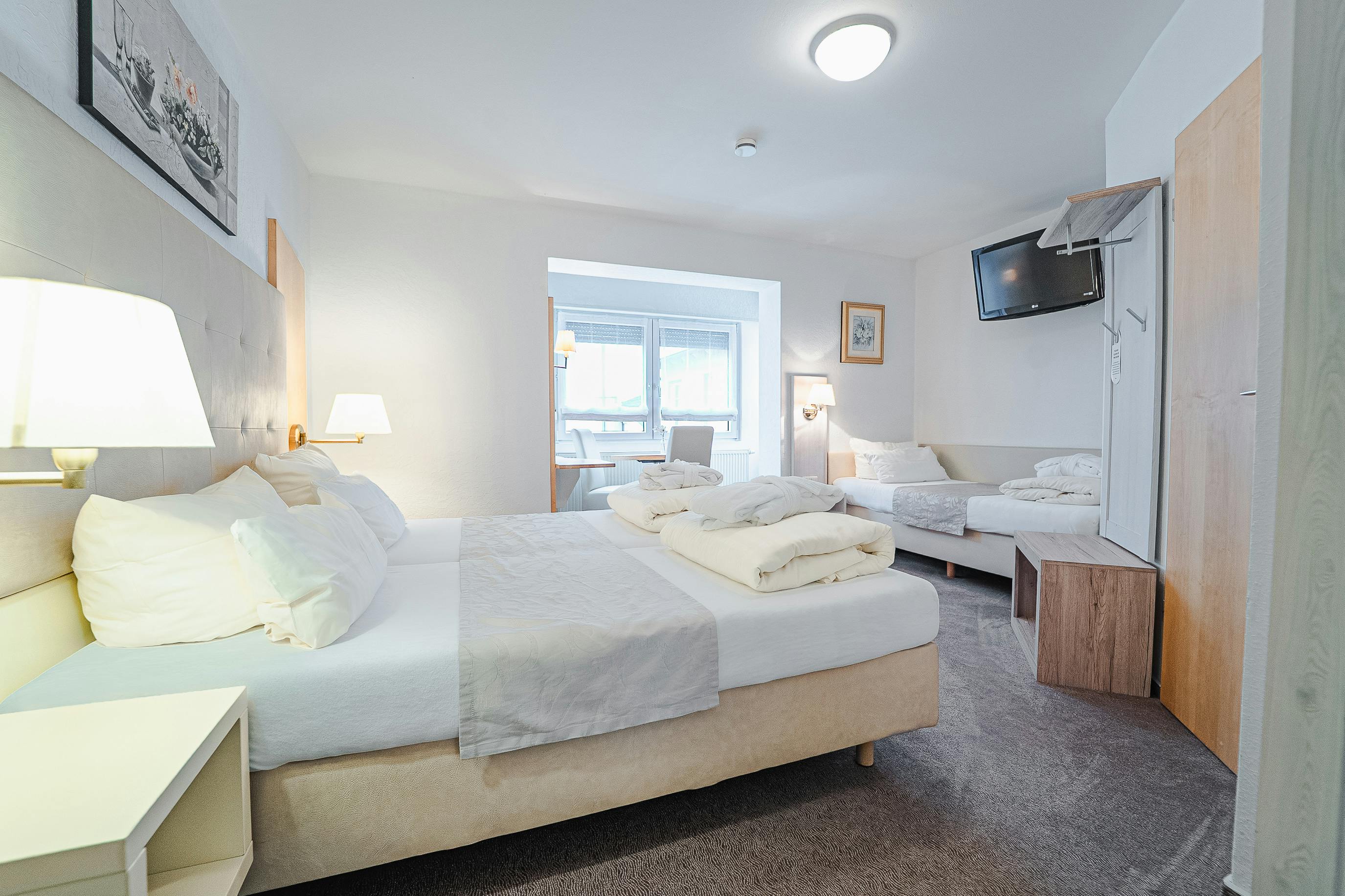 Our Triple Rooms offer extra space and flexibility – perfect for families or small groups. In addition to a double bed, a third single bed is provided. The room also includes a seating area, free Wi-Fi, and a comfortable bathroom.